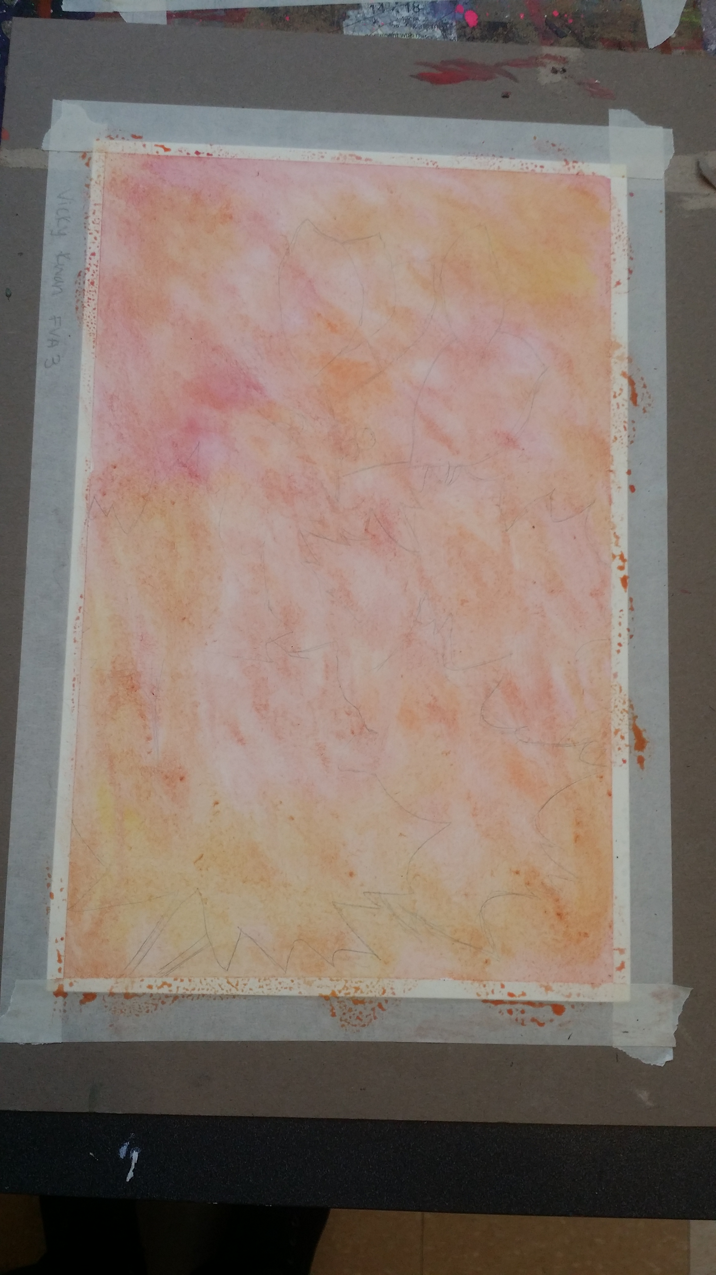 Painting the background in warm colors washes over the sketch in pencil