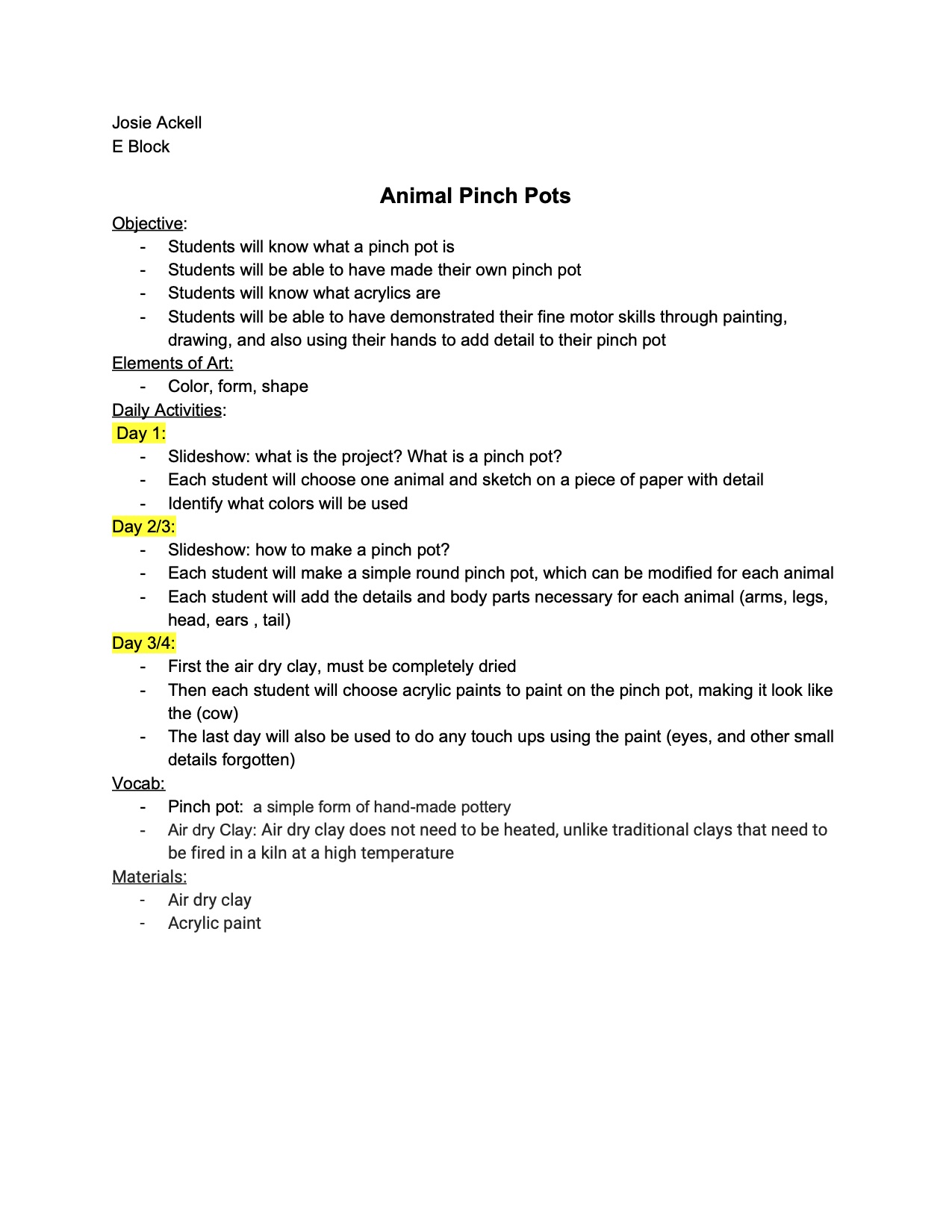 Animal pinch pots Lesson plan