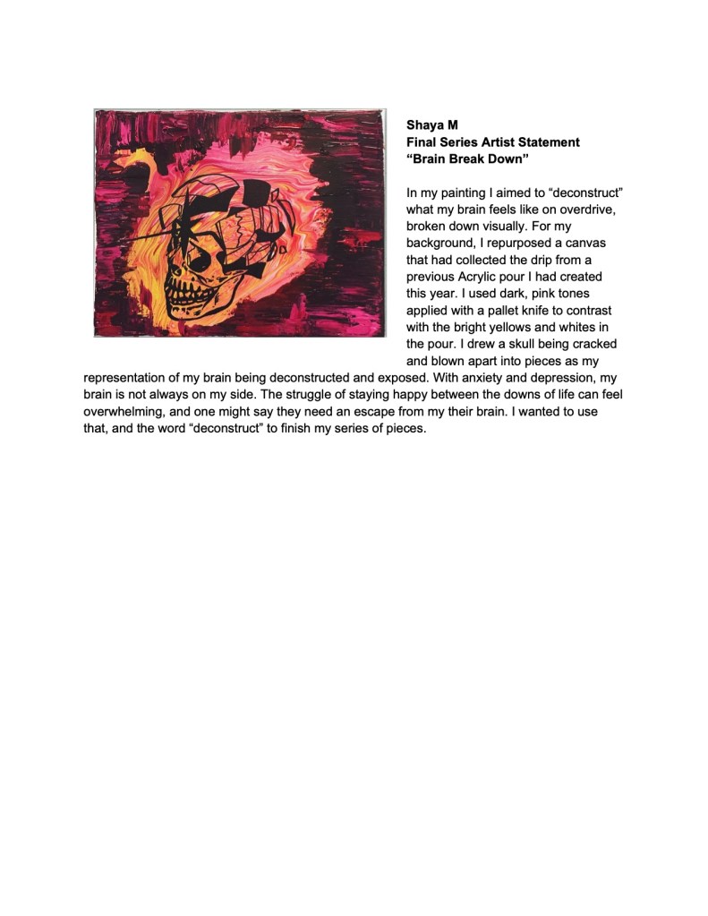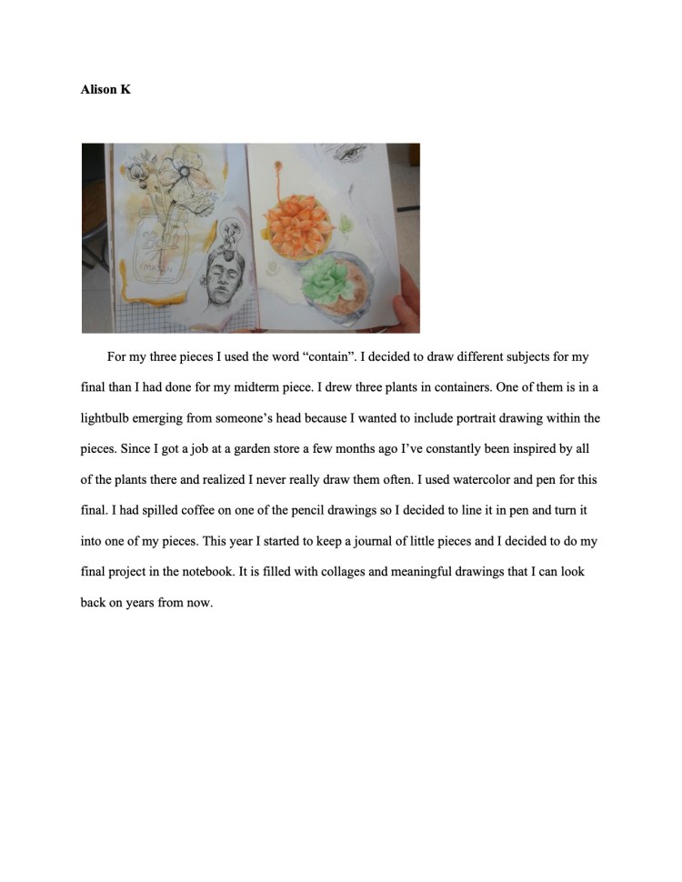 This course is designed to prepare students with a competitive portfolio of 15-20 pieces approximately half of which will be drawn from life. To that end we will be studying art history, art criticism and a variety of art making techniques including drawing, painting, printmaking, and sculpture.